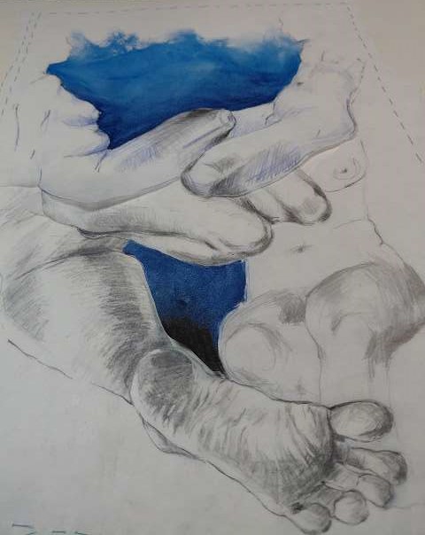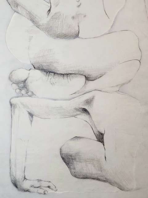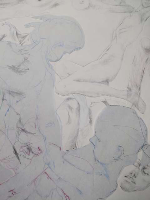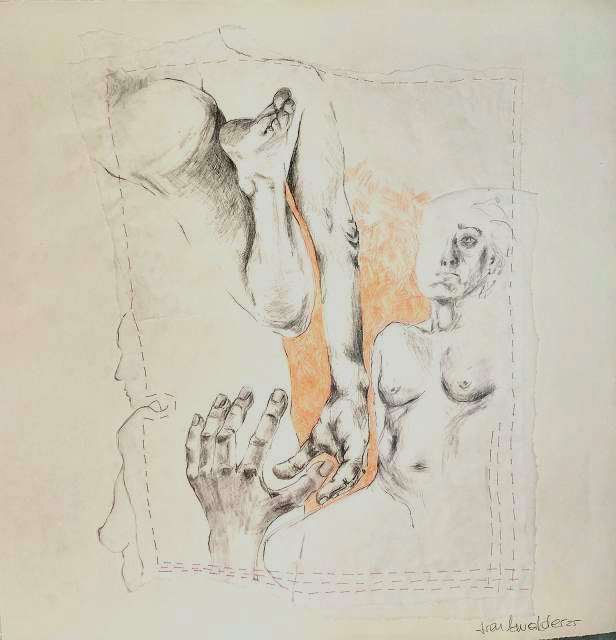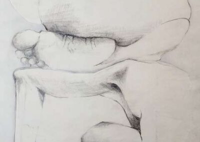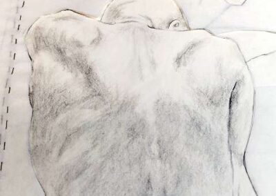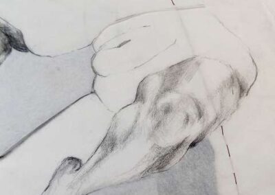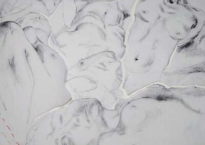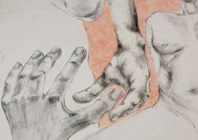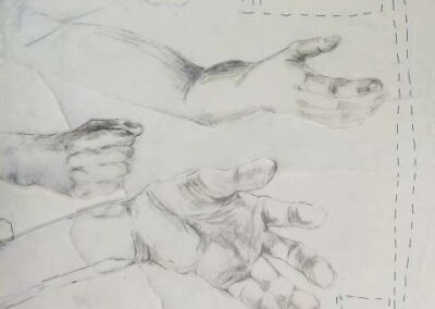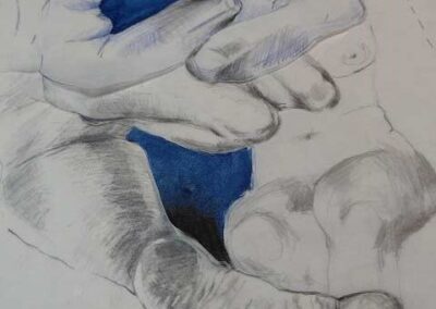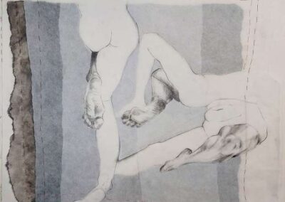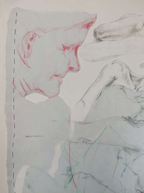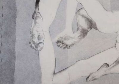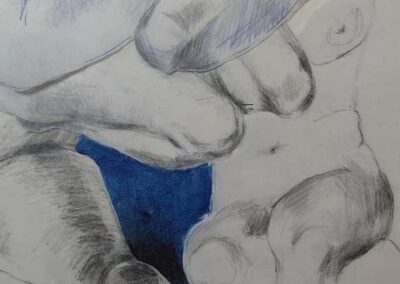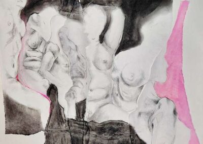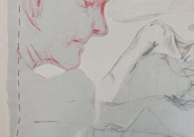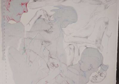 Die Bildreihe Layers besteht aus Bleistift- und Buntstiftskizzen, entstanden in Aktzeichnungen nach dem Live-Modell auf Transparentpapier. Die einzelnen Blätter werden übereinandergelegt und neu arrangiert. So entstehen vielschichtige Kompositionen, in denen Linien sich überlagern, Körperfragmente sich begegnen und neue Formen entstehen.