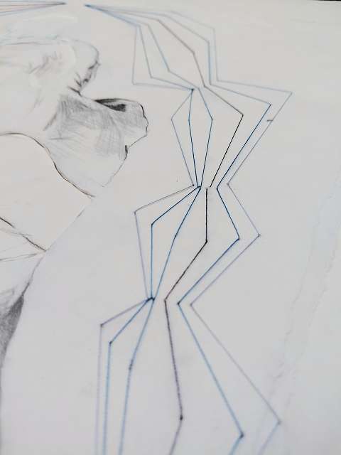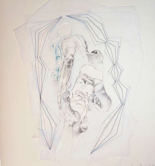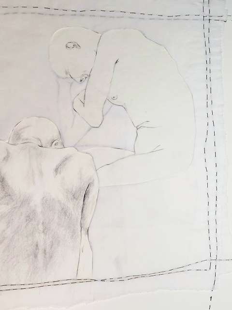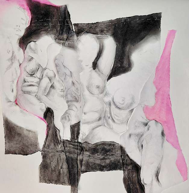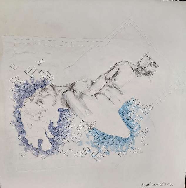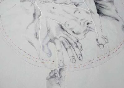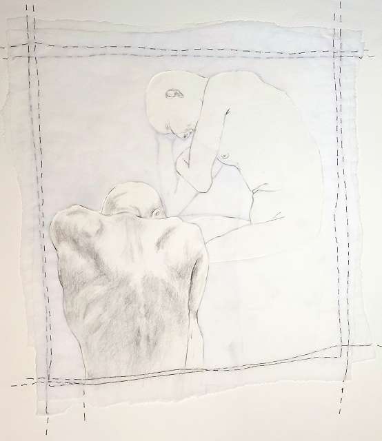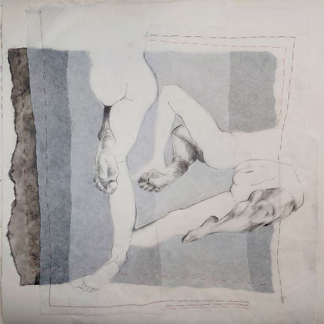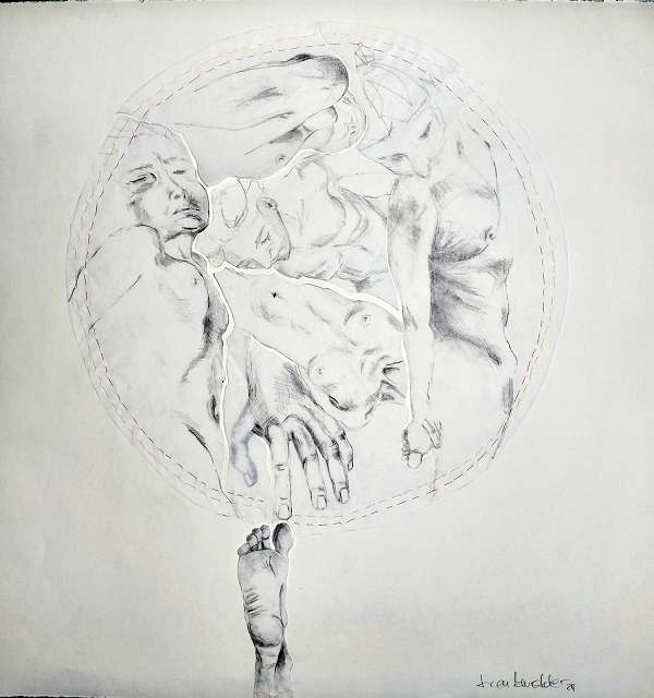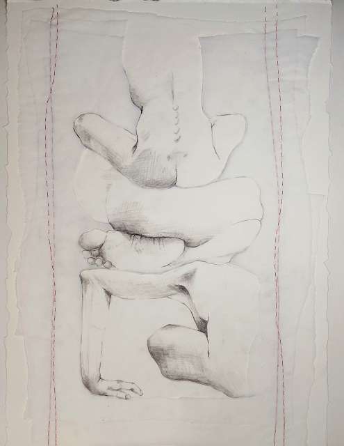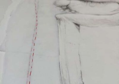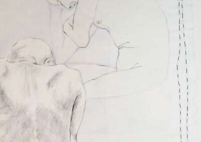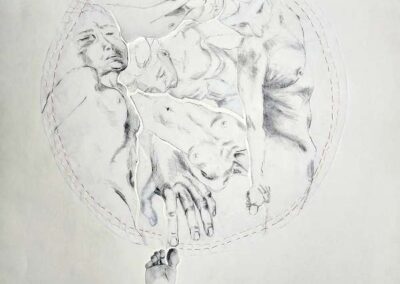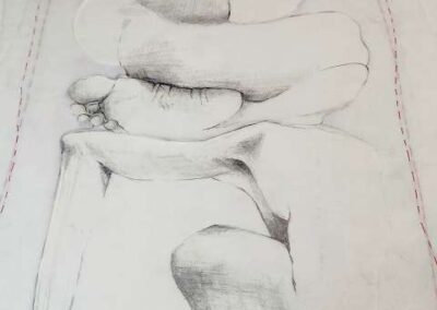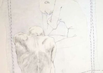 layers 5 – Bleistiftlinien auf Transparentpapier, Schicht um Schicht vernäht. Körper stapeln sich übereinander, bauen aufeinander auf, geben Halt, stützen. Durch all dies zieht sich der rote Faden – wie durch so viele Geschichten, wie durch Leben selbst. Er verbindet die Schichten, hält Fragmente zusammen und macht das Einzelne zum Ganzen.