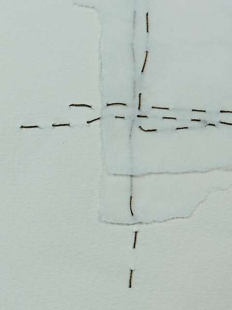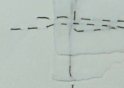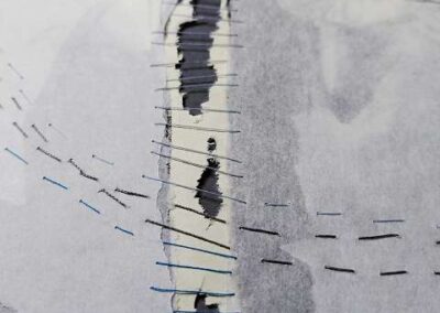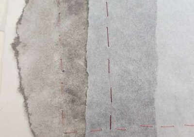 Das Vernähen der Papiere verstärkt diesen Prozess: Die Fäden halten die Ebenen zusammen, schaffen Strukturen und Verbindungen. Sie machen sichtbar, wie aus Fragmenten, Überlagerungen und Brüchen neue Sinnzusammenhänge entstehen.