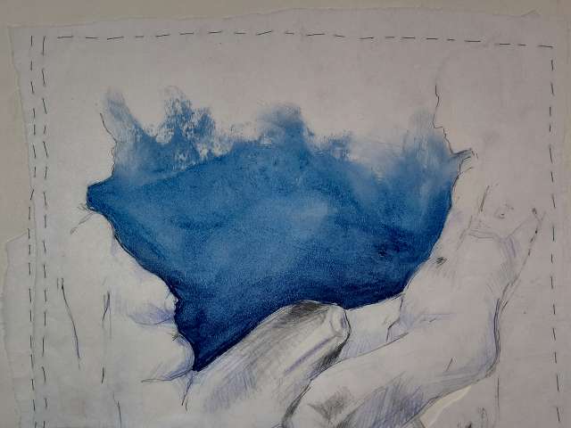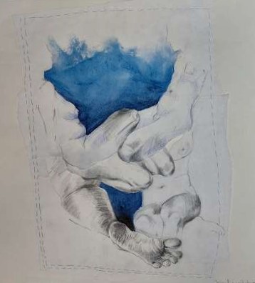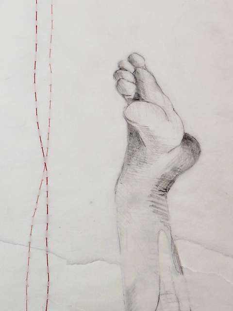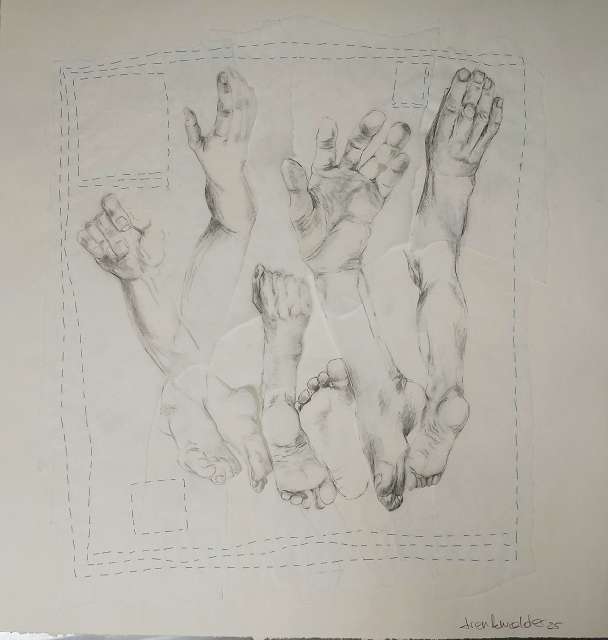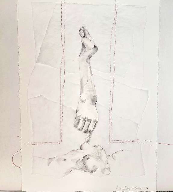 layers 3 – Eine Skizze auf Transparentpapier, durch Nähte zusammengehalten. Hände strecken sich empor, dem Himmel entgegen – suchend, hoffend. Füße bleiben am Boden, fest verankert, schwer. Gegensätze, die einander brauchen: das Oben und das Unten, Sehnsucht und Halt. Verbunden durch die Fäden, die beides zusammenhalten.