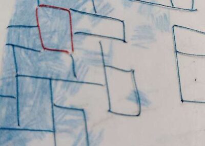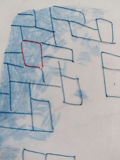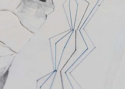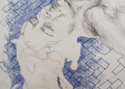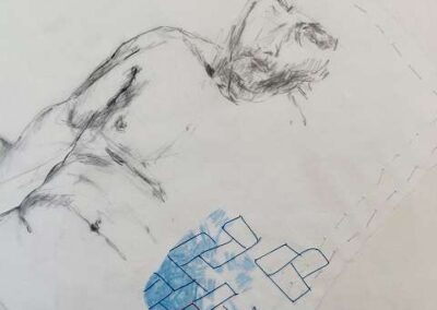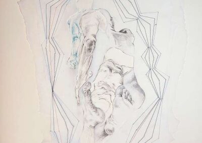 layers 22 – Bunt- und Bleistiftzeichnung auf Papier, mit Fäden vernäht. Ein Mann und eine Frau verschmelzen zu einer Einheit, verbunden durch Intimität und Zusammengehörigkeit. Ein ziegelförmig gelegter Faden hält sie zusammen – Symbol des gemeinsamen Aufbaus. Zwischen den blauen Fäden sticht ein einzelner roter Stein hervor: ein Kontrast, der Einzigartigkeit und Spannung betont.
